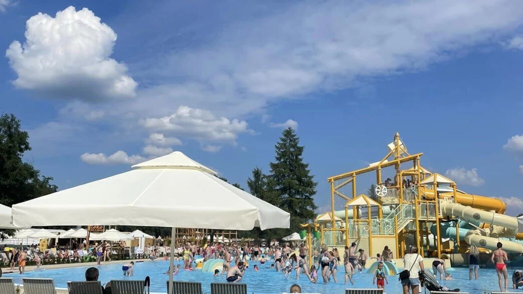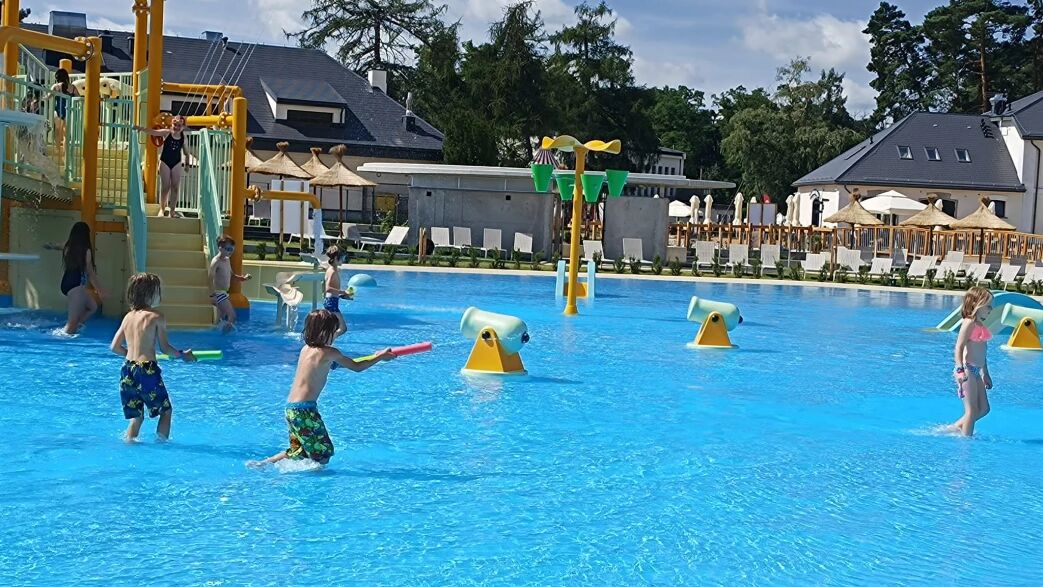 Park Wodny - do dyspozycji 5 zjeżdżalni, strefa basenowa poziomowana do głębokości maksymalnej 2 m, spray park (rekreacyjna strefa z niewielką ilością wody z interaktywnymi zabawkami i armatkami wodnymi), oraz strefa wypoczynkowa z leżakami i parasolami